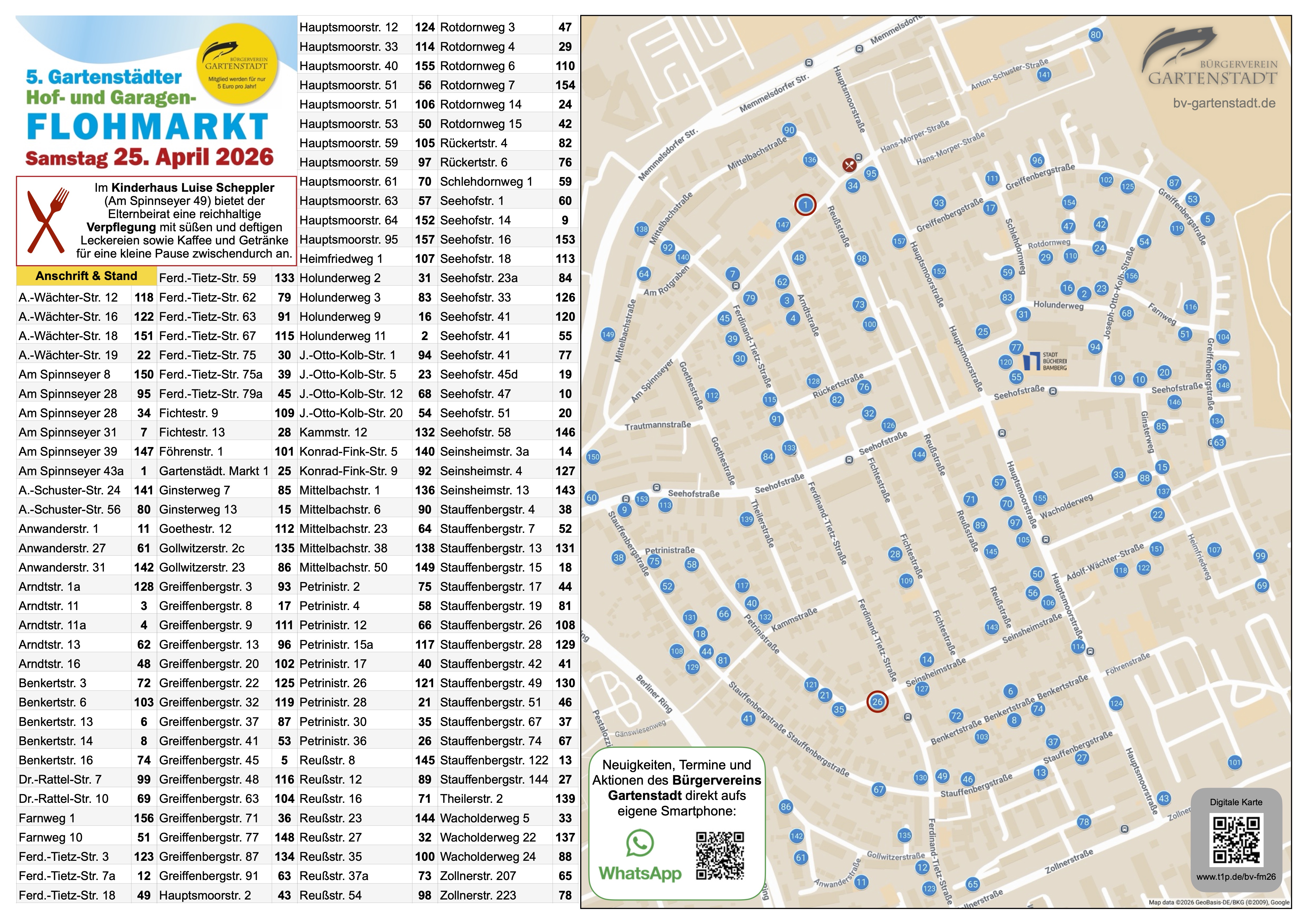 15.03.2026: 5. Gartenstädter Hof- und GaragenflohmarktAm Samstag, den 25. April 2026 verwandelt sich die Gartenstadt wieder zum Mekka für Schnäppchenjäger und Trödelfans. Viele einzelne Flohmarktstände auf privatem Grund, z. B. in Einfahrten, Höfen, Garagen und Gärten warten auf die Besucher aus Nah und Fern. Die Rahmenbedingungen mit einer virtuellen Karte aller Flohmarktstände werden dabei vom Bürgerverein Gartenstadt organisiert. Bürgerinnen und Bürger können sich ab sofort über das Online-Formular unter www.t1p.de/bv-fm26-dabei-sein registrieren. Die Registrierung ist für Mitglieder kostenlos! Eintrag von Nicht-Mitgliedern bei einer Spende ab 7 Euro 20.07.2025: Kirchweihzeitung 2025Vollgepackt mit allen Informationen zur 70. Gartenstädter Kirchweih wird die Kirchweihzeitung an alle Haushalte in der Gartenstadt und in Kramersfeld verteilt. Mit einem Klick auf das Cover öffnet sich die digitale Version. 15.07.2025: 70. Kirchweih in der GartenstadtDie Gartenstädter Kirchweih bietet vier Tage lang Festbetrieb mit Fahrgeschäften, Kinderaktionen, einer gröäen Tombola und spannenden Radrennen. An jedem Tag sorgt Live-Musik fär beste Stimmung – von Blasmusik bis Partybands ist fär jede Altersgruppe und jeden Geschmack etwas dabei! Ein besonderes Highlight ist das Bobby-Car-Rennen fär Kinder am Samstag, das Kinderprogramm am Sonntag sowie der Familiennachmittag am Montag mit vergünstigten Preisen bei den Schaustellern. 08.06.2025: Johanni-Feier in der GartenstadtAm Samstag, den 28. Juni 2025 veranstaltet der Bürgerverein Gartenstadt ab 19:30 Uhr rund um den Gartenstädter Markt die traditionelle Johanni-Feier mit Bratwurst, Bier und Blasmusik von den Bon Bosco Musikanten Bamberg. Herzliche Einladung! 21.04.2025: Flohmarkt-Lageplan steht zum Download bereit!Der Lageplan zum 4. Gartenstädter Hof- und Garagenflohmarkt am Samstag, den 26. April 2025 steht jetzt zum Download bereit. Kein Drucker? - Kein Problem! An den Ständen Nr. 2 - Am Spinnseyer 43a - und Nr. 10 - Petrinistr. 36 - liegen die Pläne zum Mitnehmen bereit. 08.04.2025: Schon registriert zum Hof- und Garagenflohmarkt?In diesem Jahr ist der Eintrag in die digitale Flohmarkt-Karte an eine Mitgliedschaft im Bürgerverein oder eine Spende ab 7 Euro gekoppelt. - Warum? Weil die Organisation viel Arbeit macht – und wir rund 800 Euro in Werbung investieren. Deshalb ist es nur fair, wenn sich die Standbetreiber zumindest in kleinem Rahmen daran beteiligen. Leider sieht es danach aus, dass es etliche Leute geben wird, die das umgehen wollen. Zum aktuellen Zeitpunkt sind 100 Stände weniger registriert als im vergangenen Jahr. Das finden wir enttäuschend, denn Gemeinschaft lebt vom Mitmachen! Wenn die Veranstaltung dieses Jahr nicht wenigstens kostendeckend ist, wird es leider die letzte Auflage sein. Das wäre wirklich schade! 25.03.2025: 4. Gartenstädter Hof- und GaragenflohmarktAm Samstag, den 26. April 2024 verwandelt sich die Gartenstadt wieder zum Mekka für Schnäppchenjäger und Trödelfans. Viele einzelne Flohmarktstände auf privatem Grund, z. B. in Einfahrten, Höfen, Garagen und Gärten warten auf die Besucher aus Nah und Fern. Die Rahmenbedingungen mit einer virtuellen Karte aller Flohmarktstände werden dabei vom Bürgerverein Gartenstadt organisiert. Bürgerinnen und Bürger können sich ab sofort über das Online-Formular unter www.t1p.de/bv-fm24-dabei-sein registrieren. Die Registrierung ist für Mitglieder kostenlos! Eintrag von Nicht-Mitgliedern bei einer Spende ab 7 Euro 19.03.2025: Ist hier Gras über die Sache gewachsen?Etliche Gartenstädterinnen und Gartenstädter fragen nach, was aus dem Standortvorschlag der Stadtspitze zur möglichen dezentralen Unterbringung von Flüchtlingen in der Gartenstadt unter der Hochspannungsleitung geworden ist. Daher hier ein Update: Dieser Standortvorschlag ist vom Tisch. Offiziell heißt es "Neben einzelnen Wohnungen wurden hier durch Investoren u.a. eine leerstehende Gewerbeimmobilie sowie ein zu beplanendes Grundstück angeboten. Eine Kombination der einzelnen Angebote lässt für den Sozialraumcluster Gartenstadt/Ost eine positive Prognose zu." Das bedeutet zumindest, dass man sich von der Idee einer Containerlösung in der Gartenstadt verabschiedet hat. Andererseits wird der Freistaat Bayern auch über den 31.12.2025 hinaus am Ankerzentrum festhalten. Wir informieren, sobald es Neuigkeiten geben wird. Danke an alle, die sich aktiv und konstruktiv am Meinungsbildungsprozess zum Standortvorschlag der Stadtspitze beteiligt haben. 01.03.2025: Gartenstädter FaschingszugAm Faschingssamstag, den 1. März 2025 zieht der Gartenstädter Gaudiwurm wieder ab 14:00 Uhr durch die Gartenstadt. Zugstrecke: Seehofstraße, Joseph-Otto-Kolb-Straße, Holunderweg, Gartenstädter Markt. Abschluss mit Bewirtung im Kunigundensaal |